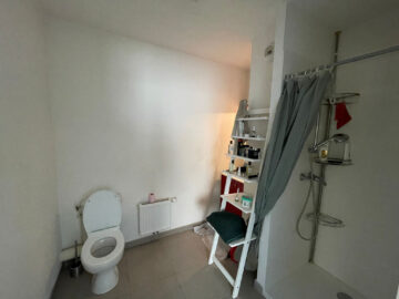 Côté nuit, vous retrouverez une grande chambre avec placard d’environ 12m2 ainsi qu’une salle d’eau avec WC.