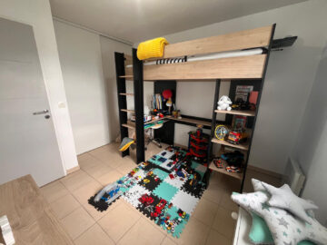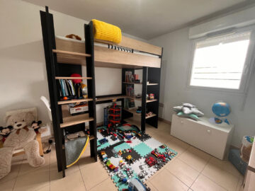Cet appartement possède deux chambres d’environ 10 m2 chacune avec placard de rangement, un bureau d’environ 10m2 permettant d’agrandir la pièce de vie et une salle de bain avec WC séparé.