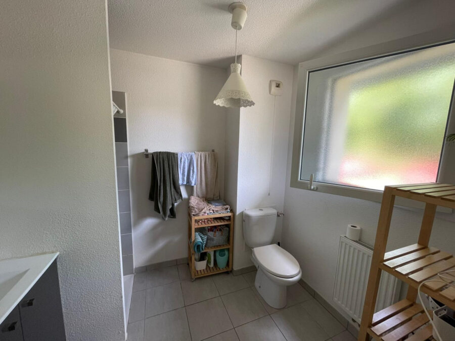 Côté nuit, vous retrouverez une chambre avec placard intégré et une salle d’eau équipée d’une grande fenêtre et des wc.