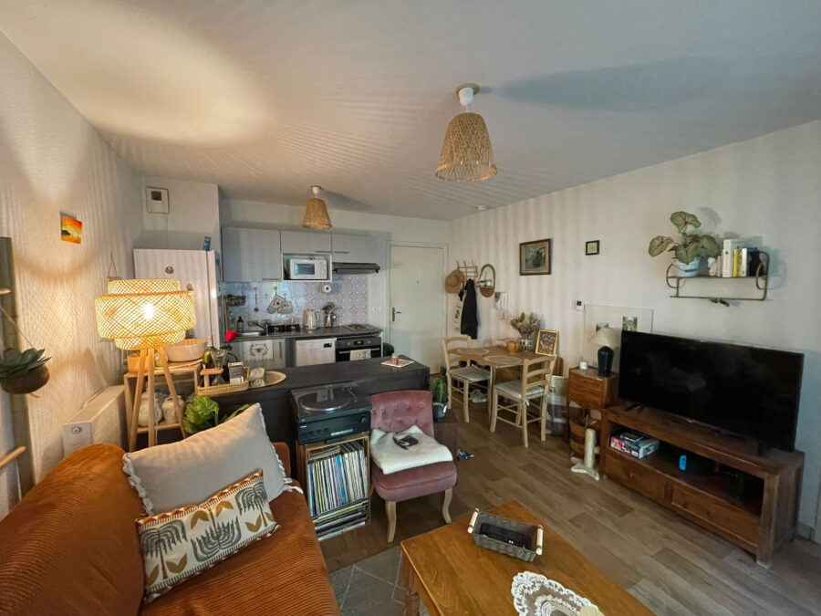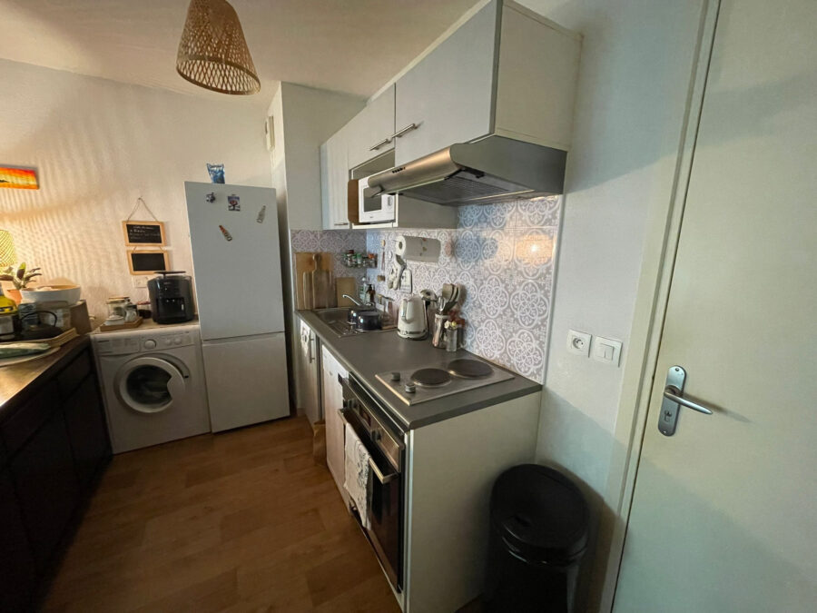 Ce bien est composé d’une cuisine semi-équipée ouverte sur le séjour donnant sur une loggia.