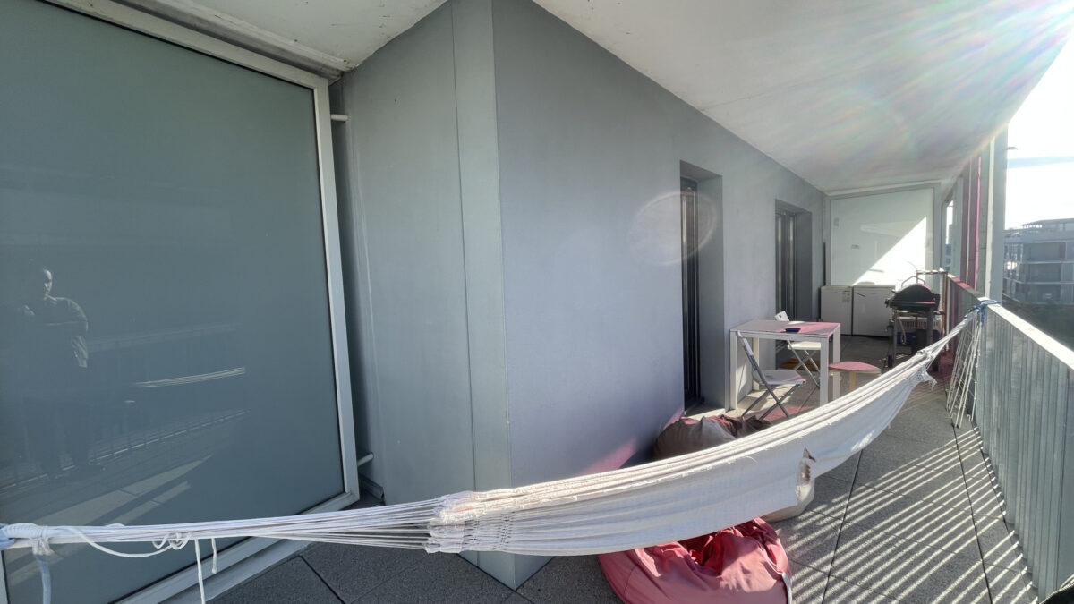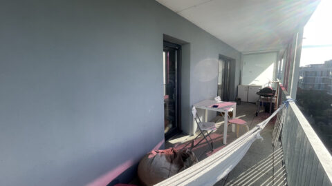 L’appartement, qui se trouver au quatriéme étage, est doté d’une cuisine semi-équipée ouverte sur un séjour lumineux exposé sud-ouest et d’une surface de plus de 27m2 donant sur un balcon d’environ 17m2.
