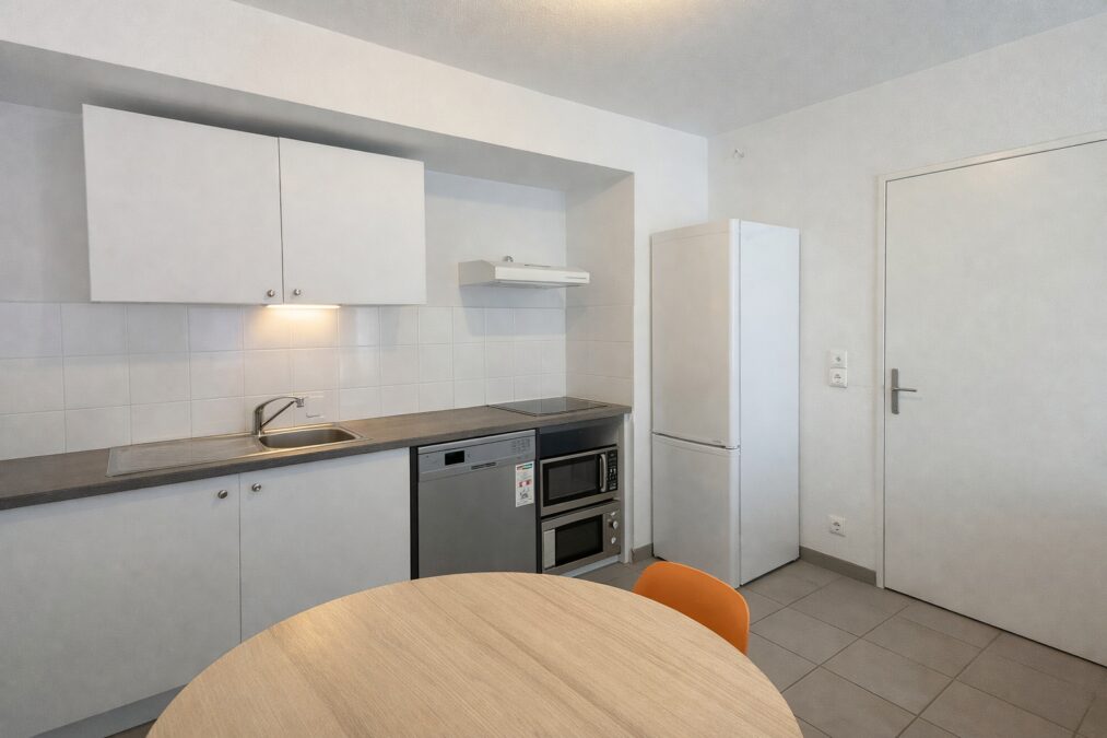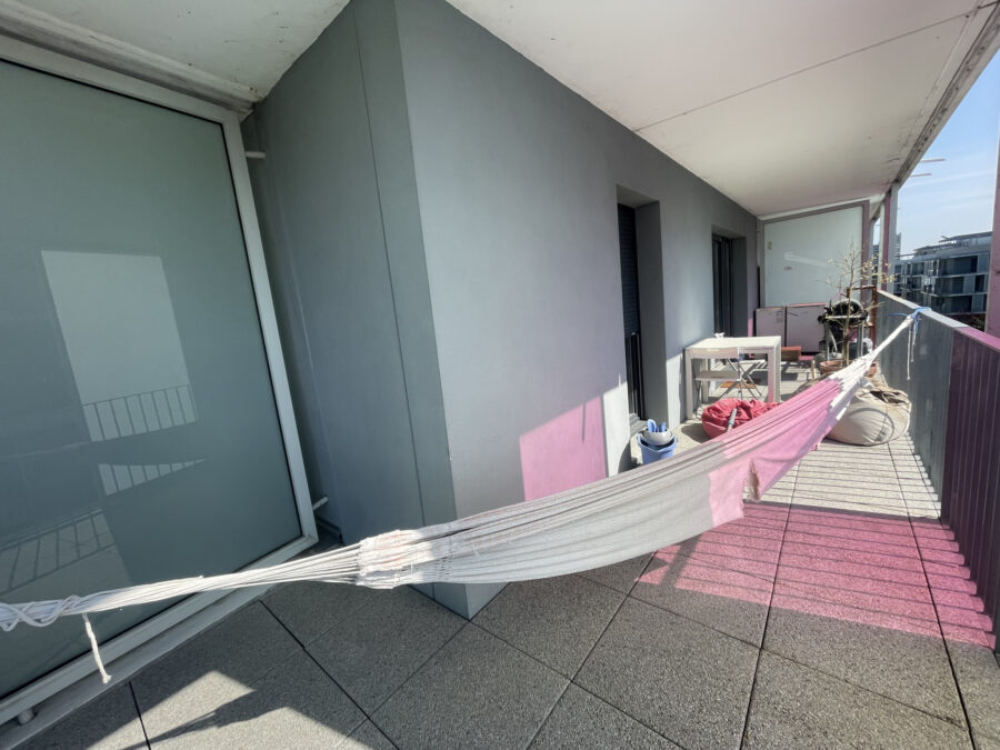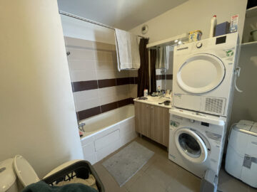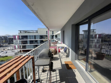 L’appartement, qui se trouve au quatriéme étage, est doté d’une cuisine semi-équipée ouverte sur un séjour lumineux exposé sud-ouest et d’une surface de plus de 27m2 donant sur un balcon d’environ 17m2.