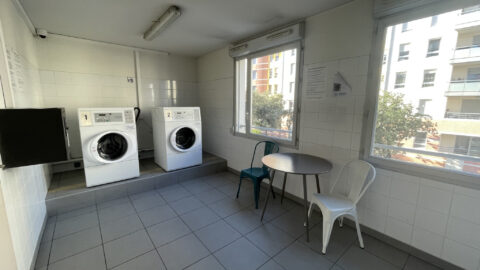Parties communes à disposition du locataire à savoir laverie avec lave-linge, sèche-linge, salle commune de divertissements (télévision, canapé, table…)