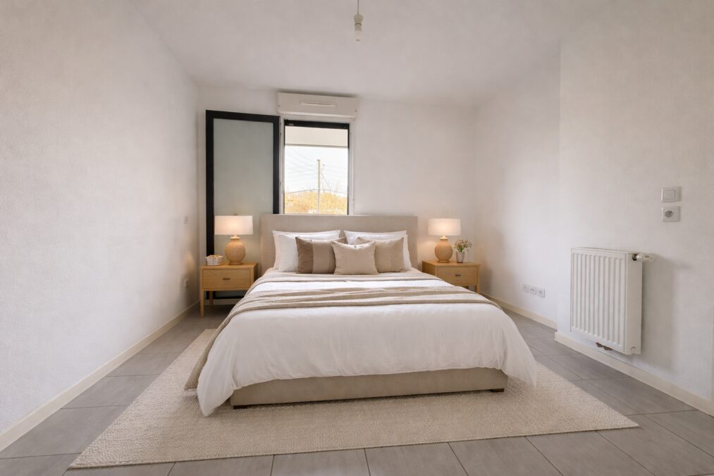 La chambre de 12m2 qui donne également sur la loggia comporte un placard et donne directement sur une salle d’eau + WC.